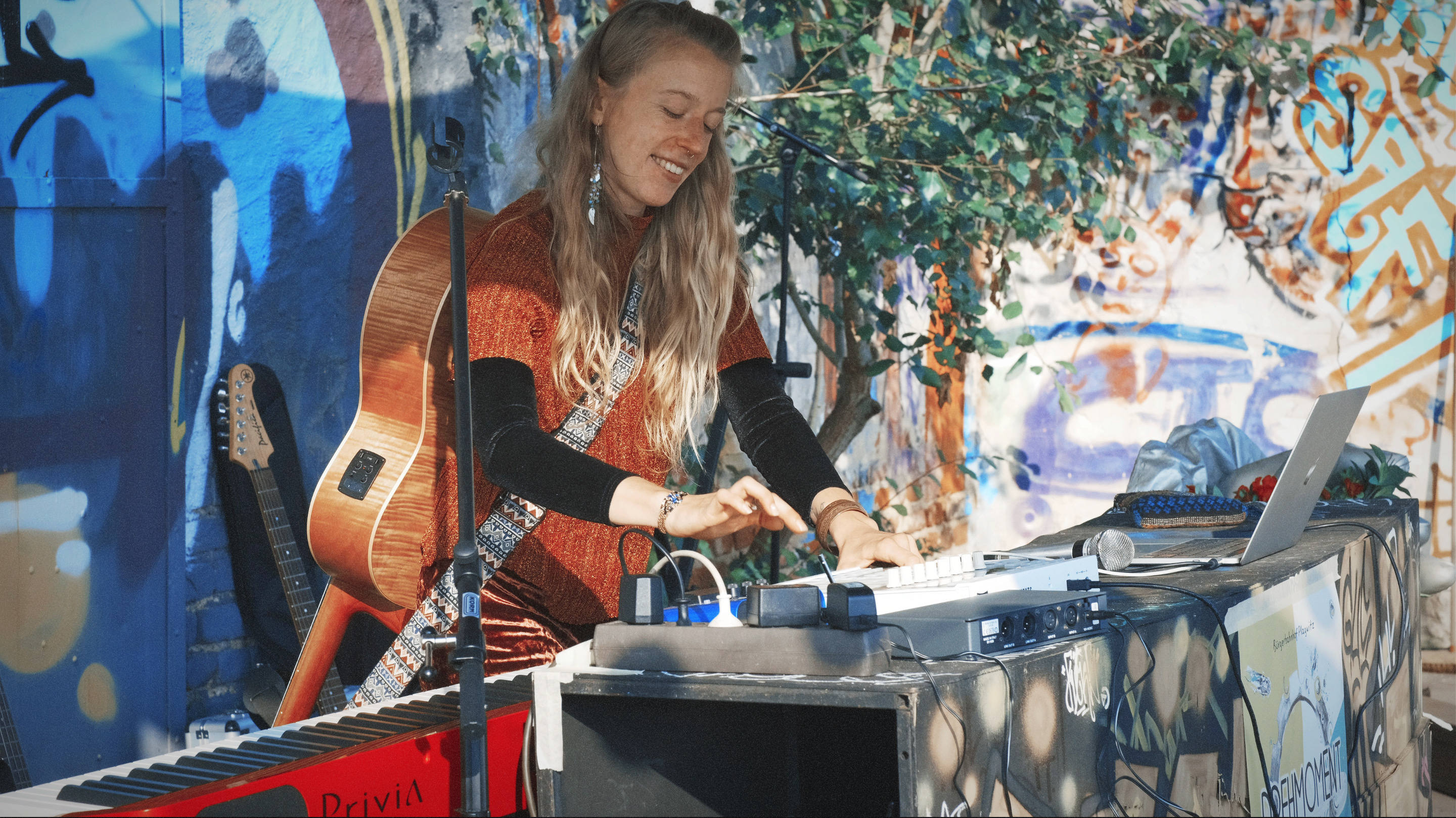 Die Solokünstlern ist auf den Straßen der Welt zu Hause und genau dort entsteht ihre Musik - unterwegs und in Bewegung. Kein Wunder also, dass sich die gebürtige Brackenheimerin mit einer Urgroßmutter aus Schweden eine Loopmaschine angeschafft hat, so fällt es zunächst gar nicht auf, dass sie Solo unterwegs ist. Denn Instrumente spielt sie viele, im Alter von 6 Jahren begann sie mit klassischem Klavierunterricht und mit 14 Jahren lernte sie die ersten Gitarrengriffe von ihrem Vater.